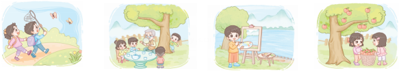 5、典典记录了郊游所见,但有些字词不会写,只好用拼音代替,请帮他写出来。
