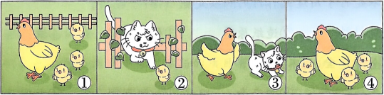 8、认真观察图片,想一想鸡妈妈带着小鸡在哪里?干什么?其中一只小鸡遇到了什么危险?结果怎么样?请你把四幅图的内容连起来说一说,用几句话把这件事情写下来。