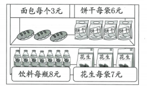 20、(1)、买5袋花生和1个面包一共需要多少元?(2)、用50元买1瓶饮料,剩下的钱可以买多少袋饼干?(3)、请你提出其他数学问题并解答。