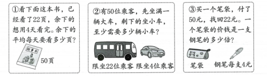 8、以下三个问题能用(50-22)÷4解决的是( )。A、只有①② B、只有②③ C、①②③