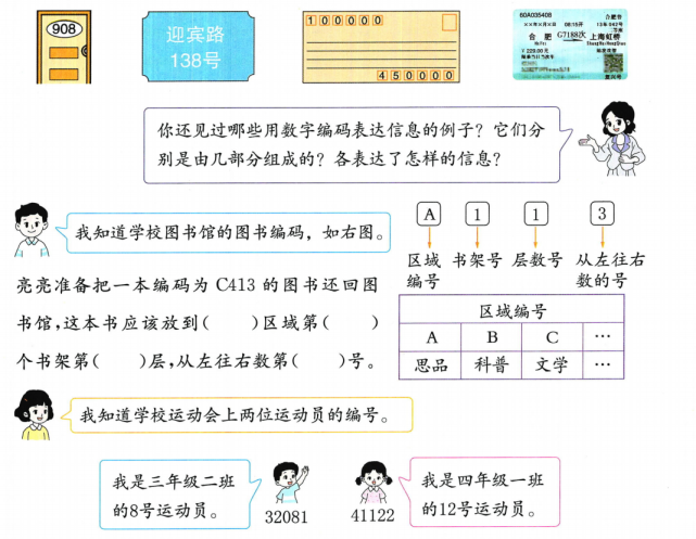 2、生活中,我们经常看见一些像电话号码、门牌号码这样用数字编成的号码。你知道下面这些号码分别表示什么吗?(1)、根据上面的规律说一说号码“63062”表示什么?(2)、轩轩的哥哥是五年级二班的11号运动员,他的编号应该是多少?