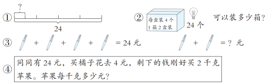 4、下列问题中,可以用 24÷4÷2 来解决的是( )。A、仅① B、②④ C、①② D、③④