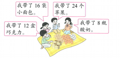 12、午餐时间到!同学们在老师的带领下在公园野餐。下面是奇奇和好朋友们带的食物。(1)、平均每人分到几袋小面包?(2)、平均每人能分到几瓶酸奶?(3)、请你再提出一个用除法解决的问题并解答。