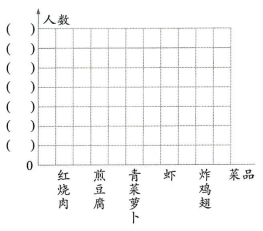 (1)、根据表中的数据完成条形统计图。(2)、根据统计图,可以看出该小学四年级学生最喜欢吃的人数最多,最喜欢吃和的人数一样多。 -