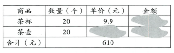 12、“无由持一碗,寄与爱茶人。”随着饮茶之风的兴盛,茶具的品种越来越多,质地也越来越精美。(1)、做一个茶杯要用0.85kg的陶土,4.08kg的陶土可以做个茶杯。(2)、商场购进一批茶具,采购员不小心将清单弄脏了,请你计算出茶壶的单价。(3)、甲工厂一年可以生产16.1万套茶具,( ),乙工厂一年可以生产多少万套茶具?