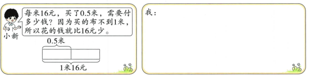 13、在计算小数乘法时我们发现:当一个不为0的数乘一个小于1 的数时,结果会越乘越小。如:16×0.5=8,这是为什么呢?小新举了个例子,并画了图来解释,请你也试试看。