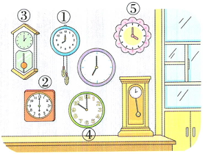 4、John家附近新开了一家钟表店。看图,判断句子正误。(1)、It's eight o' clock on ①.(2)、It's seven o' clock on ②.(3)、It's three o' clock on ③.(4)、It's ten o' clock on ④.(5)、It's four o' clock on ⑤.
