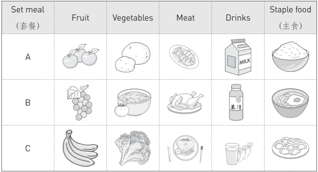 I want three kinds of vegetables. One from roots, one from fruits and one from leaves. And I need meat, a drink and staple food too.