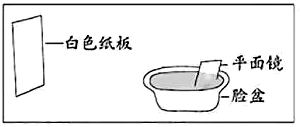 如图所示,小科将盛有半盆水的脸盆放在阳光下,在不远处立好白色纸板,再将一个平面镜放入盆中,不断调整位置。