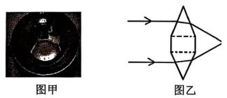 学习了光单元后,小科拿着妈妈刚买的不锈钢碗,在碗里观察到了自己的像(如图甲),他思考这个像是怎么形成的呢?小美拿来爷爷看书用的放大镜,发现放大镜是中间凸起边缘比较薄的玻璃体,和三棱镜是不是也有关系呢?他俩查阅资料发现:这个碗形状可以看作是一个凹面镜,也和平面镜一样是会反光的;放大镜是可以看作两个三棱镜和透明方形玻璃体的组合(如图乙)。观察下面两幅图,结合题意完成下列练习。