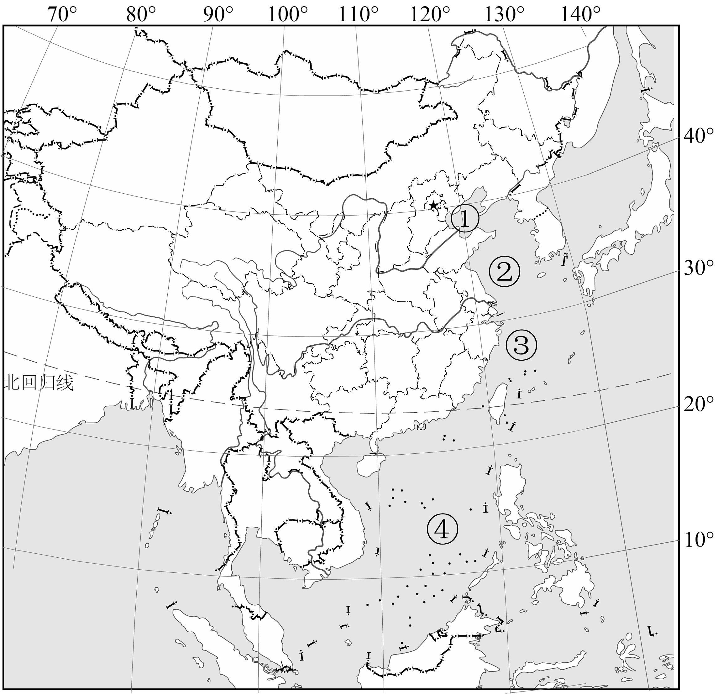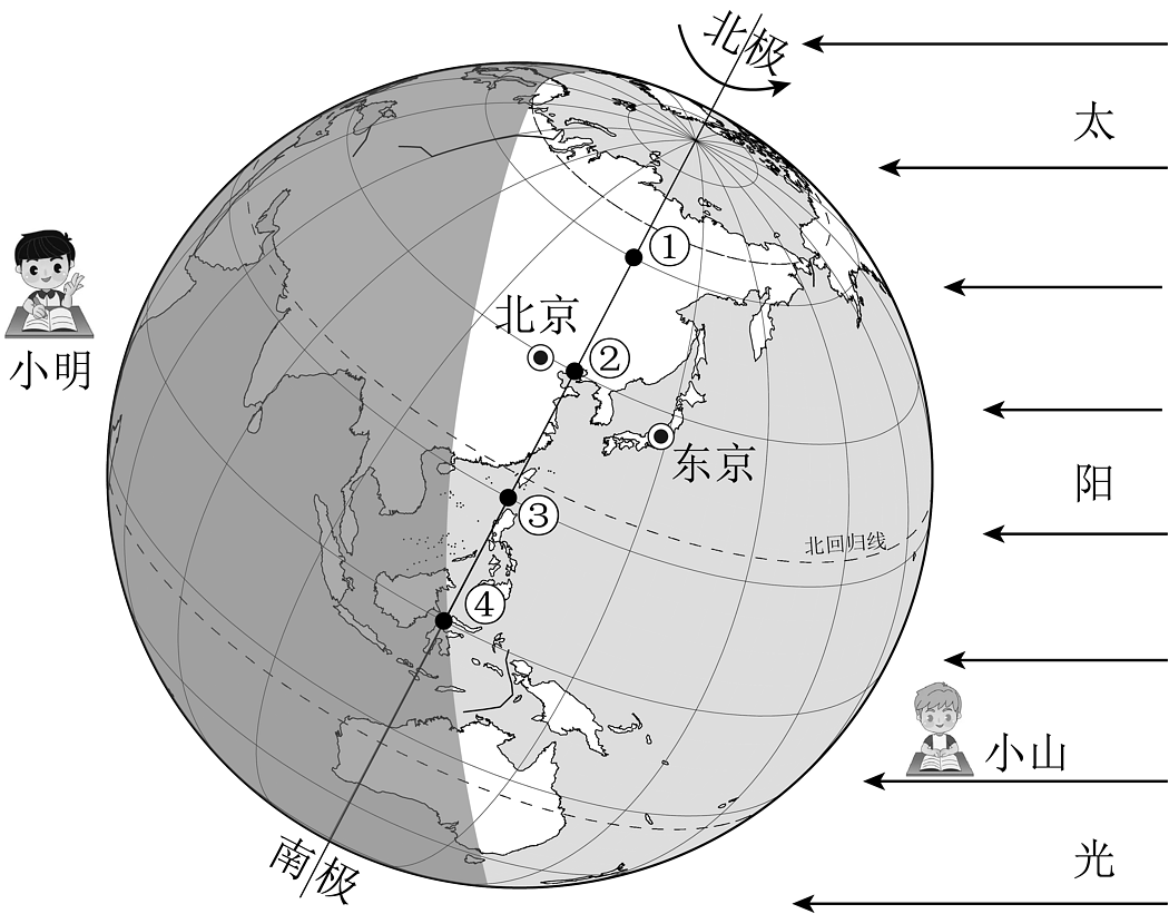 (5)图示时刻,图中①、②、③、④四地,即将迎来白昼的是地。东京的日出时间比北京的更(填“早”或“晚”)。