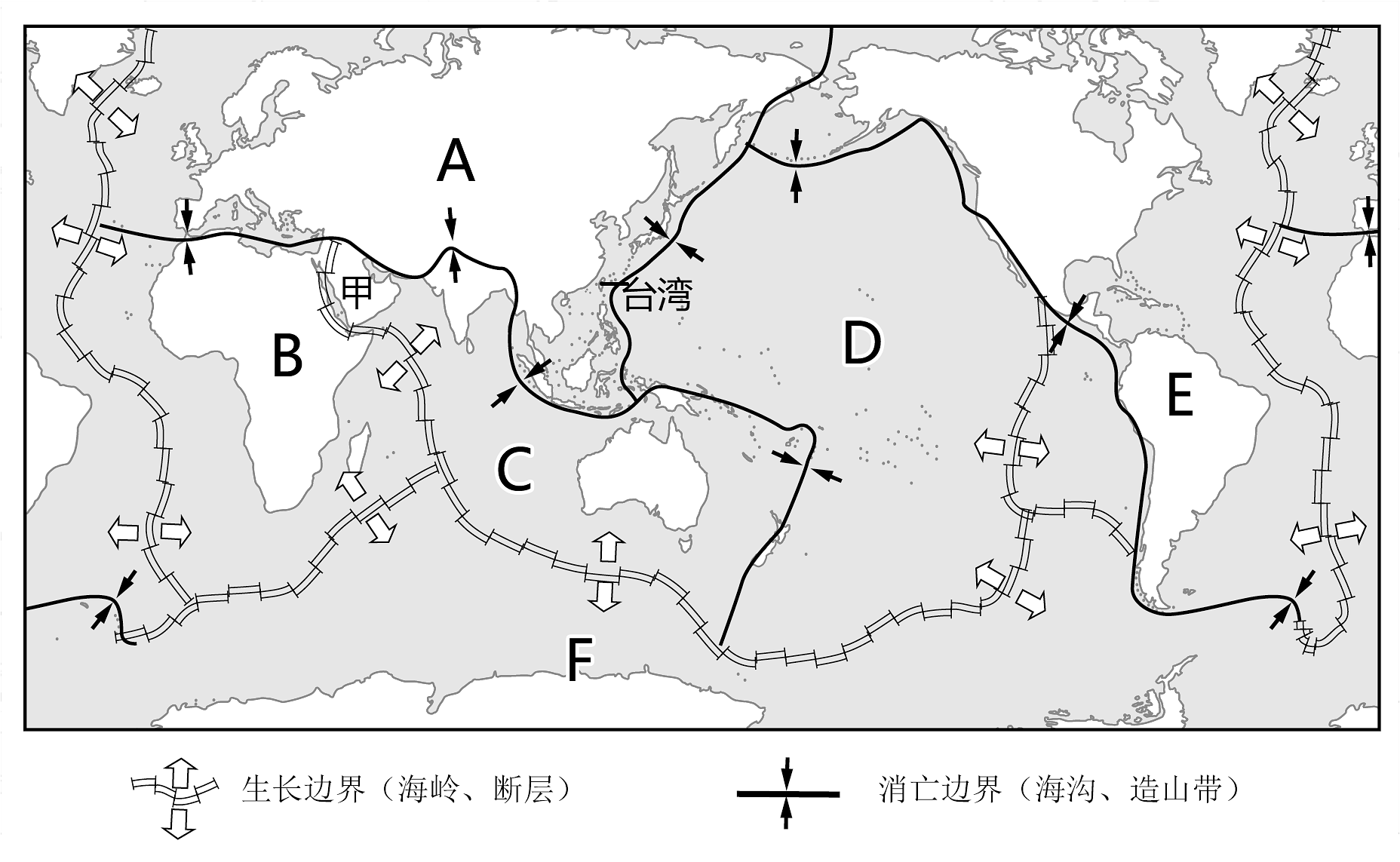 15、读板块构造图,回答下列问题。(1)、图中,几乎全部为海洋的板块是 , 我们伟大的祖国主要地处的板块是。(两空都要填字母和板块名字)(2)、甲地属于是板块,其西侧的红海面积在不断(“扩大”或“缩小”)。(3)、板块在不断运动变化,请用板块构造学解释我国台湾多火山地震的原因。