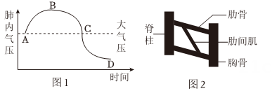 12、第九届亚冬会于2025年2月举行,比赛中队员们奋力拼搏,呼吸急促。分析题图呼吸曲线和模型,关于曲线叙述正确的是( )A、C点表示吸气结束的瞬间 B、BC段对应图2中肋间肌收缩 C、CD段胸廓容积缩小 D、CD段对应图2中肋骨上提