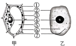 17、如图是动、植物细胞的结构示意图,对其描述不正确的是( )A、植物体内所有细胞的结构都和图甲所示植物细胞是一样的 B、水煮菠菜时,水能变成绿色是由于加热破坏了结构② C、将图甲、乙所示细胞置于清水中,可能会涨破的是图乙所示细胞 D、将大蒜捣成蒜泥时,满屋的蒜味来自结构⑤