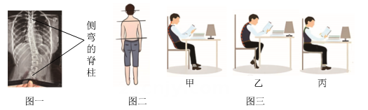 10、近年来,河北对全省中小学生开展脊柱侧弯专项筛查。图一为某脊柱侧弯患者的射线透视图像,图二为某种脊柱侧弯筛查姿势示意图,图三为3种不同坐姿示意图。