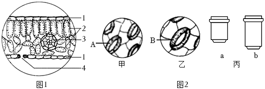 17、在学习了生物圈中的绿色植物后,小明从超市购买了新鲜菠菜,开展了以下探究。(1)、选取新鲜的叶片,制作成临时切片放置在低倍显微镜下观察,视野中出现如图1所示的结构,其中[2]细胞内含大量的叶绿体,能进行光合作用。(2)、撕下菠菜叶的表皮制成临时装片,可以在显微镜下观察到如图2所示的视野。由两个[A]细胞构成的气孔是作用的“门户”和气体交换的窗口。若要视野完成甲→乙的变化,先将装片向移动,直至A细胞到达视野中央,再换用图2丙中的镜头(填标号),然后调节细准焦螺旋。