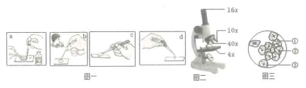 1、回答下列探究实验的相关问题:(1)、为探究动物细胞的结构,同学们在实验室制作人体口腔上皮细胞的临时装片,并用显微镜进行观察。图一中实验的正确操作顺序是(用图中字母和箭头表示);用图二所示显微镜对临时装片进行观察,当视野中看到细胞数量最多时,显微镜的放大倍数为倍;图三为某同学在显微镜下观察到的口腔上皮细胞示意图,经染色后细胞中着色最深的结构是。若将图三中细胞①移至视野中央,需将玻片标本向移动,还可调节使物像更清晰。(2)、某同学想为家里的鱼缸安装一盏照明灯。为了寻找最适光源,他利用金鱼藻进行了实验探究:将长势相同的金鱼藻随机均分为4组,分别放入盛有500mL碳酸氢钠溶液(能为金鱼藻提供二氧化碳)的大烧杯中,标为甲、乙、丙、丁;在暗室中分别用不同功率的节能灯作为唯一光源,并将其置于距离烧杯20cm处(见下图)。