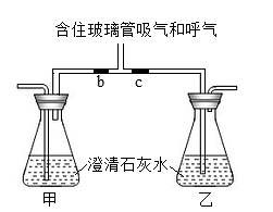20、为了验证人体呼吸过程中气体成分——二氧化碳的变化(二氧化碳能使澄清石灰水变浑浊),王力设计了如图的实验装置,对该实验表述错误的是( )A、甲、乙装置中加入的液体都是澄清石灰水 B、吸气时,打开b处开关,关闭c处开关 C、呼气时,打开c处开关,关闭b处开关 D、实验现象:甲变浑浊,而乙无明显变化