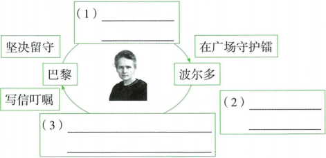 (1)、阅读文章,完成下面有关居里夫人经历的思维导图。(2)、下列对文中画横线句子的批注是同学提出的疑问,请你帮助解答。①批注一:A句写居里夫人把孩子托付给别人,不利于刻画她的正面形象,为什么还要写呢?