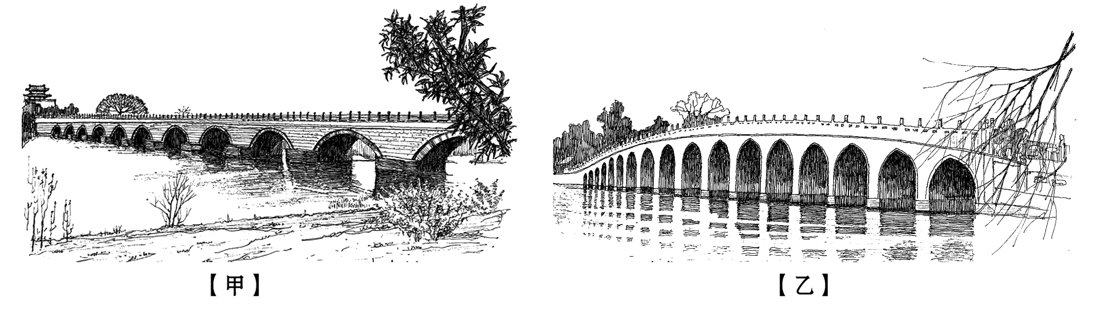 (1)、下面哪一幅素描勾勒的是卢沟桥?请结合材料一的内容,做出判断并简要说明理由。(2)、在材料一和材料三横线处依次选填词语最恰当的一项是( )A、光彩夺目 崭露头角 B、惟妙惟肖 引人瞩目 C、惟妙惟肖 崭露头角 D、光彩夺目 初显模样(3)、从上述三则材料可以看出,中国桥梁既有结构 的卢沟桥、外观 的十七孔桥,又有设计 的跨海穿山大桥,不断在创新中发展,向世界展示中国人的智慧与才能。(每空限2个字) -