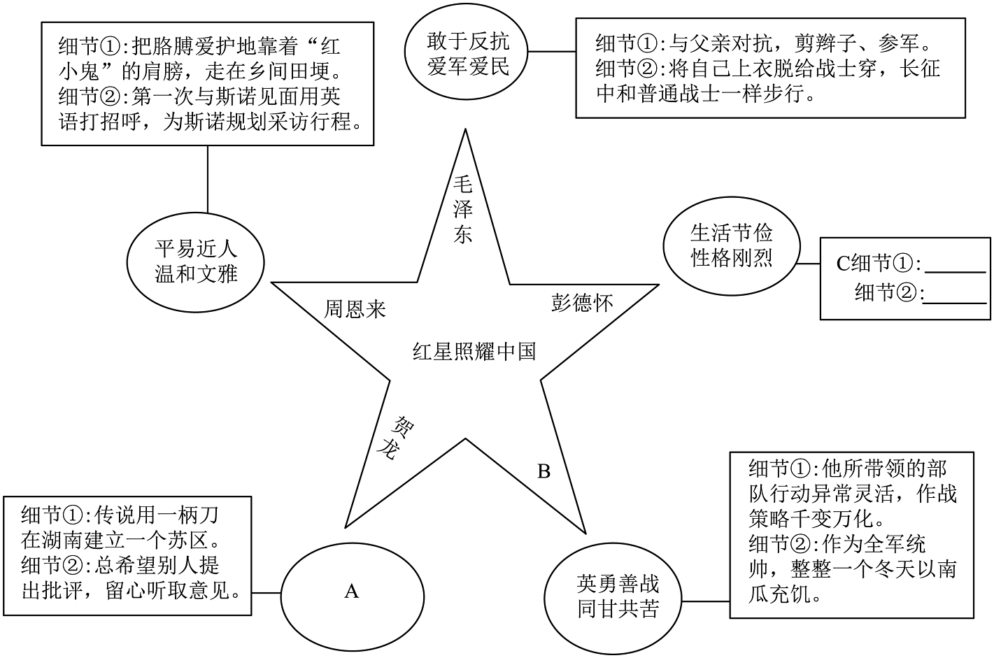 19、下面是小文同学在阅读《红星照耀中国》时,以“领袖人物形象”为主题梳理的一份思维导图,有A、B、C三处尚未填出,请仔细阅读导图 , 帮小文完成。