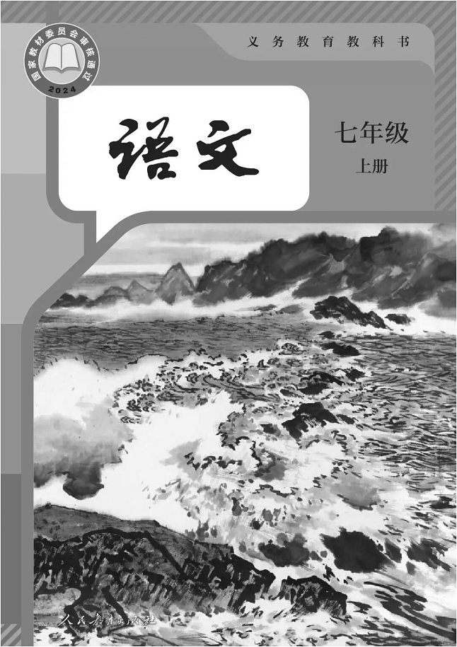语文是否美丽,这常常(qǔ jué)于我们能否带着欣赏的眼光去感受。细细端详七年级上册语文教科书,别致的封面便贮蓄着浓郁的语文之美。教科书封面主要由文字和图画两部分组成。“语文”二字是封面最显眼的文字。这两个字 甲 (A.苍劲 B.沧桑)有力,生动流畅。图画部分来自孔仲起的画作《新潮》(局部)。画面中近海远山,洪波涌起,不禁让人想到曹操的诗篇《观沧海》, 乙 (A.浩繁 B.浩渺)的海面上,云蒸霞蔚,景象千姿百态,十分壮观。既雄浑又精致的的画风(hōng tuō)出了气韵生动的语文之美,这一切都让人感慨万千。语文,真美!