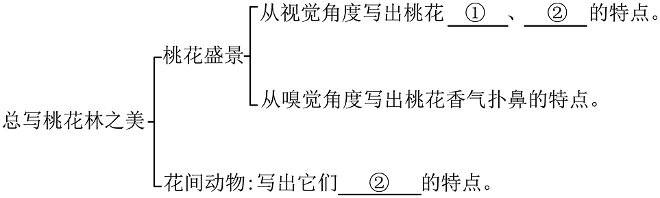 解说:这句话适合连读,一气呵成,减少句子间的停顿,表现我欣赏桃花的急切心情。