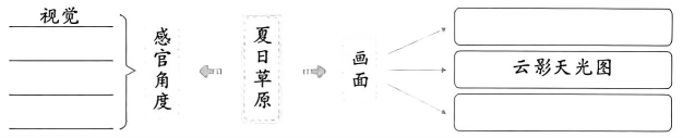 (1)、文章从不同的感官角度描写夏日草原的画面,请补全下面的思维导图。(2)、细读文章,下列说法不正确的是哪一项?( )A、文中画横线的句子是作者对草原的错觉,侧面写出了草原的宽广舒展。 B、文中画波浪线的句子运用了比喻的修辞手法,生动地表现出云朵的形态。 C、作者把夏日草原比作“天堂”是因为那儿美景如画,万物和谐,令人畅快。 D、文中画双横线的部分描绘的景象与《敕勒歌》中“天似穹庐,笼盖四野”相同。(3)、文章第⑥⑦⑧段主要描写了夏日草原的什么特征?这些描写表达了作者对夏日草原怎样的思想感情?(4)、第⑧段既描写了香草,又融入了作者的感受。结合文章,说一说在写景时融入作者的感受会有怎样的好处。(5)、第⑨段中说“我当然明白我的祖先在游牧生活里有许多艰难之处”,请根据所读内容想开去,想象一下“我”的祖先以前可能过着什么样的游牧生活。 -