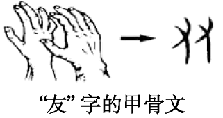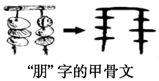“朋”:像两串贝壳并排系在同一根棍子上,“朋”为古代的货币单位,有“平等”之意,引申为“朋友”“同类相好”。