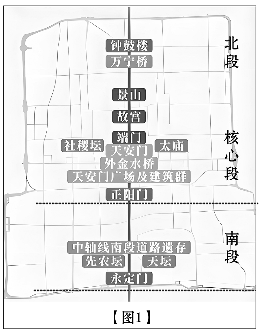 北京中轴线始建于元,成型、丰富于明清,发展、传承于近现代,在不同历史阶段的城市发展中均得到尊重与延续,展现出持久的生命力。钟鼓楼及周边的街区,其肌理与历史功能形成于13世纪元大都时期并延续至今,为元明清三代北京中轴线位置与走向的延续提供了历史见证;景山、故宫、端门、天安门、外金水桥、正阳门,都是15世纪明朝迁都北京时建设的结果;再向南至永定门,其规划格局与主要建筑群形成于16世纪中叶。天安门广场及建筑群中的其他建筑为20世纪50至70年代建设,但其规划格局依然延续了北京中轴线居中对称的景观形态。