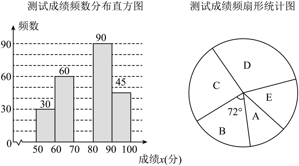 20、人工智能的应用非常广泛,比如自然语言处理、语音和图象识别、搜索排名、专家系统等.为了解学生对人工智能应用的知晓程度,某校随机抽查部分中学生,进行知识测试,得分用x表示,数据分组为A:、B:、C:、D:、E: , 并将测试成绩绘制成如下不完整的统计图,请根据图表信息回答问题:(1)、随机抽查的学生共有人;扇形统计图中“E”组所对应的圆心角度数为°;(2)、该校约有7000名学生,请估算等级为C的学生约有多少人?(3)、在本次调查中,等级为E的学生中,仅有一名男生和三名女生的测试成绩为满分,若从中随机抽取两人进行活动交流,请利用画树状图或列表的方法,求恰好抽到一名男生和一名女生的概率.