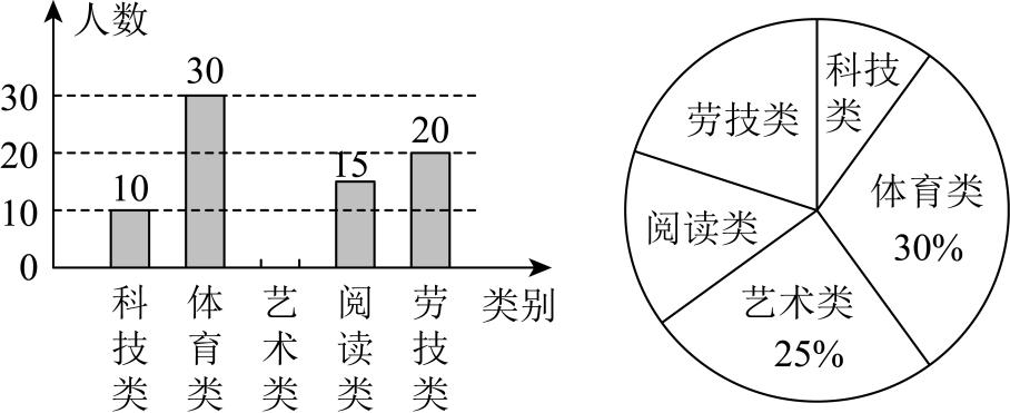 16、为丰富学生的校园生活,提升学生的综合素质,某校计划开设丰富多彩的社团活动.为了解全校学生对各类社团活动的喜爱情况,该校随机抽取部分学生进行问卷调查(每名学生必选且只选一类),并根据调查结果制成如下统计图(不完整):