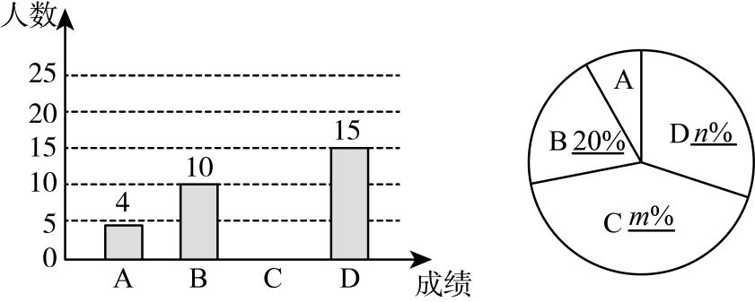 15、为庆祝中国共产党成立100周年,某校举行党史知识竞赛活动.赛后随机抽取了部分学生的成绩,按得分划分为A , B , C , D四个等级,并绘制了如下不完整的统计表和统计图.