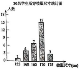 20、 据调查,八年级某班30名学生所穿校服尺寸绘制如下条形统计图:(1)、求这30名学生所穿校服尺寸的众数和中位数;(2)、若该校八年级共有600名学生,请你估计尺寸为170cm的校服需要多少件.