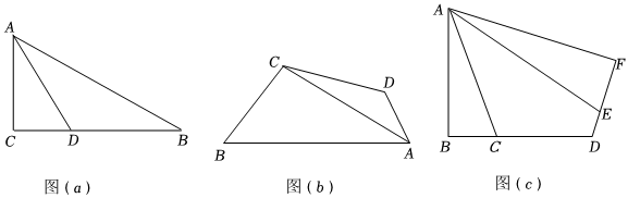 (1)、如图(a),在△ABC中,∠ACB=90°,∠B=30°,AD平分∠CAB , 试判断CD和BD之间的数量关系,并说明理由;(2)、如图(b),在四边形ABCD中,AC平分∠BAD , AC=25,AD=12,DC=BC=17,求AB的长.(3)、【拓展提高】如图(c),在四边形ABDF中,∠B=∠F=90°,∠BCA=∠AEF , ∠D-∠BAC=90°,若CD=4,AC=5,AE=6,求四边形ABDF的边DE的长.