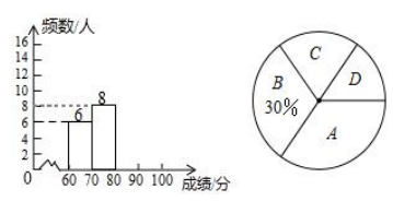 (1)、表中a=;(2)、补全频数分布直方图;(3)、计算扇形统计图中“C”对应的圆心角度数;(4)、该大学共有240人参加竞赛,若成绩在70分以上(包括70分)的为“优”等,根据抽样结果,估计该校参赛学生成绩达到“优”等的人数? -