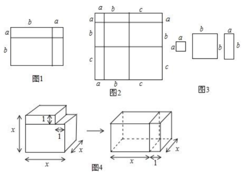 (3)、小明同学用图3中x张边长为a的正方形,y张边长为b的正方形,z张宽、长分别为a、b的长方形纸片拼出一个面积为(2a+b)(a+2b)长方形,则x+y+z=.(4)、【知识迁移】事实上,通过计算几何图形的体积也可以表示一些代数恒等式,图4表示的是一个边长为x的正方体挖去一个小长方体后重新拼成一个新长方体,请你根据图4中图形的变化关系,写出一个数学等式:. -