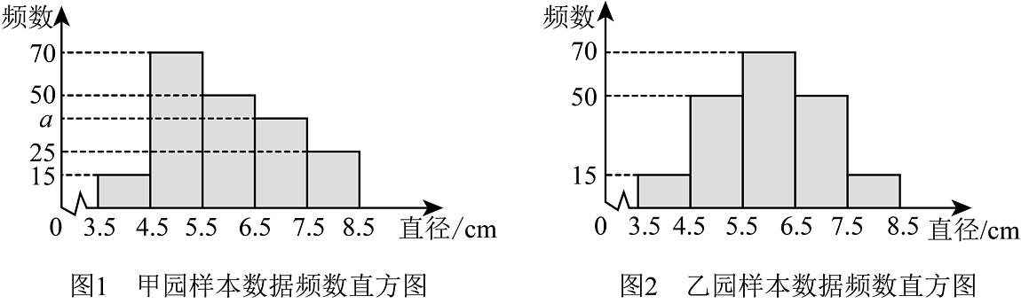 整理样本数据,并绘制甲、乙两园样本数据的频数直方图,部分信息如下: