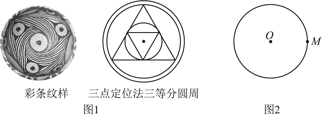 10、马家窑文化以发达的彩陶著称于世,其陶质坚固,器表细腻,红、黑、白彩共用,彩绘线条流畅细致,图案繁缛多变,形成了绚丽典雅的艺术风格.如图1的彩陶纹样呈现的是三等分圆周,古人用等边三角形三点定位的方法确定圆周的三等分点,这种方法和下面三等分圆周的方法相通.如图2,已知和圆上一点M.作法如图: