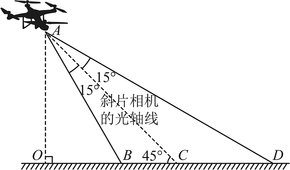 6、一架无人机在进行倾斜摄影时,已知斜片相机“光轴线”与地面的夹角为(如图),斜片相机能拍摄到的地面宽度为 . 当无人机处于离地面米时,若 , 则此时宽度的值为( )A、150 B、 C、200 D、