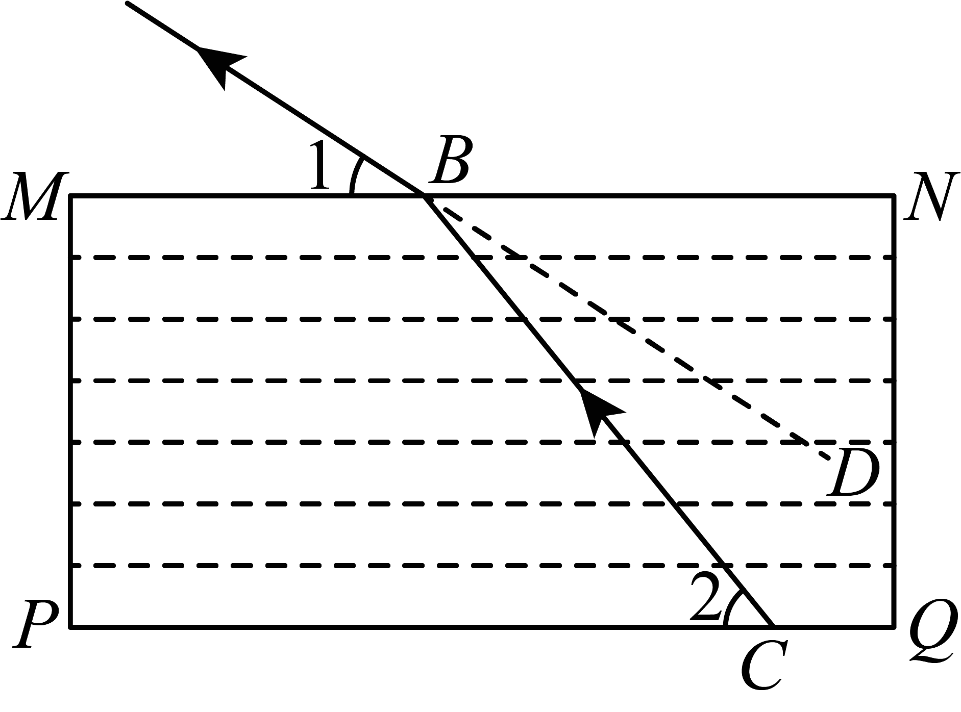 17、光从水中斜射入空气中时会发生折射现象,如图,鱼缸中在点C处的小鱼,在鱼缸上方看起来在点D处.若 , , , 则的度数是( )A、 B、 C、 D、