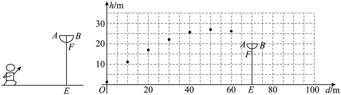 【问题情境】在校园运动会开幕式中,如图,运动会火炬手小明需要用火种点燃的箭头,然后射向距离发射点水平距离为70米、距地面的竖直高度为20米处的一个点火台上,已知点火台是一个弓形,其中米,且垂直平分这支箭(大小忽略不计)飞行的轨迹可以看作是抛物线的一部分.记这支箭飞行的水平距离为d(单位:m),距地面的竖直高度为h(单位:m).获得的数据如表: