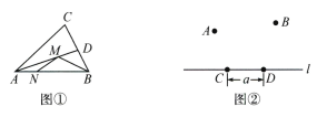 12、(1)、如图①,在锐角△ABC 中, ∠BAC 的平分线交 BC 于点 D,点 M,N 分别是AD 和AB 上的动点,求 BM+MN 的最小值.(2)、如图②,A,B 为直线l同侧两定点,C,D 为l 上任意两点,且CD=a为定值,确定C,D两点的位置,使AC+CD+BD 值最小.