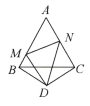 11、操作:如图,△ABC 是正三角形,△BDC是顶角∠BDC=120°的等腰三角形,以 D 为顶点作一个60°角,角的两边分别交 AB,AC 边于M,N 两点,连接MN.(1)、探究:线段 BM,MN,CN 之间的关系,并加以证明.(2)、若点 M,N分别是射线AB,CA 上的点,其他条件不变,再探索线段 BM,MN,NC 之间的关系.