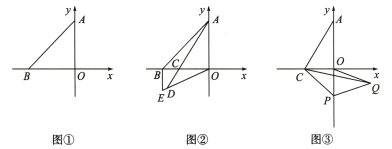 16、在平面直角坐标系中,已知A(0,4),B(-4,0),点C 为x轴上的点,△ABC的面积为2.(1)、如图①,求点C 的坐标.(2)、如图②,若点C在点B 的右侧,连接AC并延长至点D,使得DO=AO,过点B 作BE∥y 轴交OD 的延长线于点E,求OE—BE 的值.(3)、如图③,若点C 在点B 的右侧,点 P 为y 轴上一动点,以CP 为腰作等腰△CPQ,使PC=PQ,∠CPQ=2∠ACO=2α(α为定值),AC=5,连接OQ,求线段OQ的最小值.