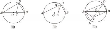 16、 已知AB为⊙O的直径,AB=8,C为AB上的动点,D为⊙O上的动点(点C,D均不与点A,B重合),连接AD,DB,DC.(1)、如图1,当C为AB的三等分点,且AC>BC时,= .(2)、如图2,若点C在半径OB上(点C不与点O重合),将CB绕点C逆时针旋转90°后得到CB',且点B'落在AD所在直线上,设BC=x, , 求y与x之间的关系式,并写出y的取值范围.(3)、如图3,若∠BDC=60°,延长DC交⊙O于点E,在DE上取一点F,使得EF= .