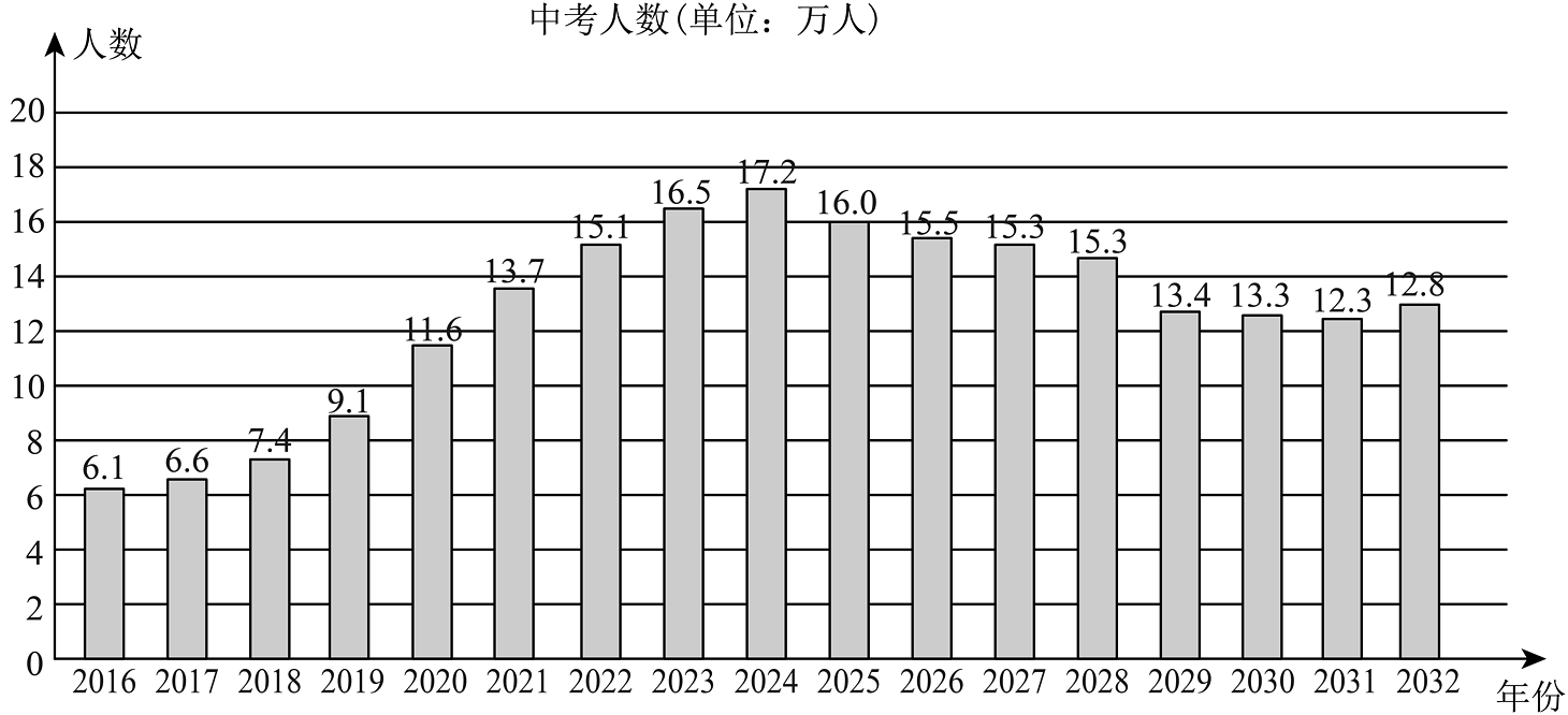 13、参加初中学业水平考试的人数简称“中考人数”.如图,某市根据2016﹣2024年中考人数及2024年上半年小学、初中各年级在校学生人数,绘制出2016﹣2032年中考人数(含预估)统计图如图: