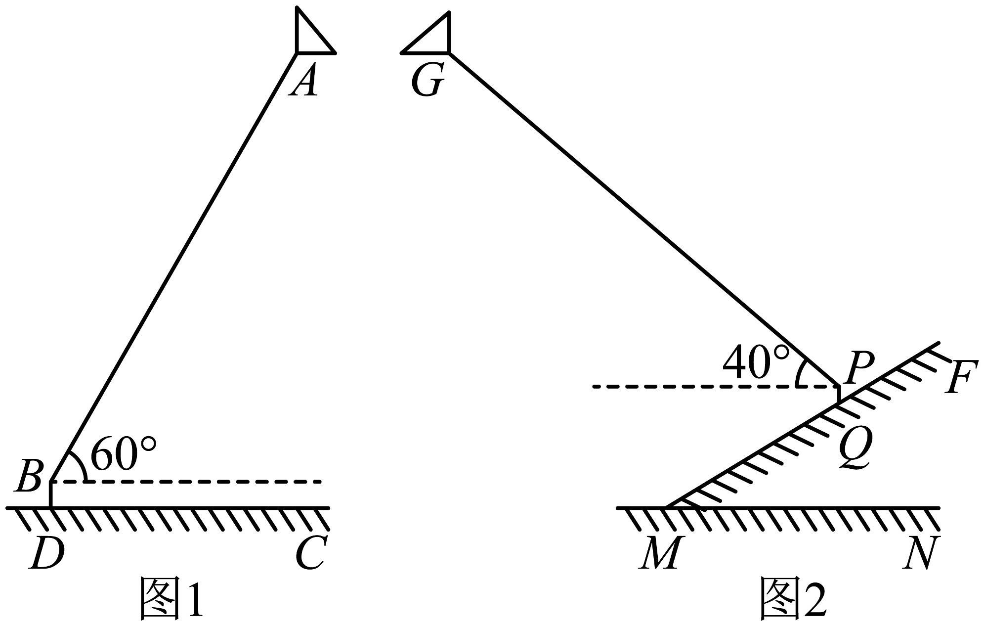 11、周末,小明的父母带着他和妹妹一起去湿地公园放风筝.如图1,妹妹的身高为1.50米,风筝线长(近似的看作直线)与水平地面构成角,米.如图2,小明的身高米,风筝线长(近似的看作直线)米.(1)、求妹妹的风筝离水平地面的高度(结果保留两位小数);(2)、小明勇于挑战,把放风筝的位置选在一个坡度的斜坡上,且坡长米,风筝线与水平面构成角.请问小明和妹妹谁放的风筝离水平地面高?(参考数据,)