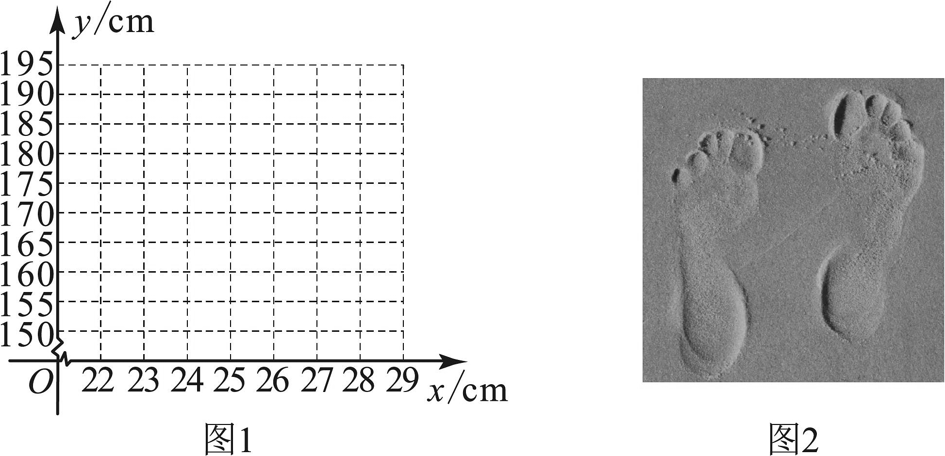 (1)、在图1中描出表中数据对应的点;(2)、根据表中数据,从和中选择一个函数模型,使它能近似地反映身高和脚长的函数关系,并求出这个函数的解析式(不要求写出的取值范围);(3)、如图2,某场所发现了一个人的脚印,脚长约为 , 请根据(2)中求出的函数解析式,估计这个人的身高. -