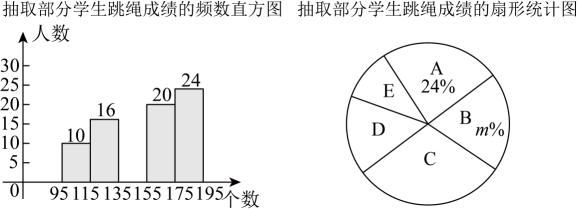 11、为了解某校九年级学生的一分钟跳绳情况,随机抽取了部分学生进行调查,并将跳绳个数分为五组: , , , , . (每组含后一个边界值,不含前一个边界值),绘制成如下两幅不完整的统计图.请根据信息,解答下列问题:(1)、扇形统计图中的 , 组所对圆心角度数为 .(2)、补全条形统计图.(3)、已知该校共有九年级学生450人,已知一分钟跳绳个数超过175个为满分,请估计该校九年级学生一分钟跳绳的满分人数。